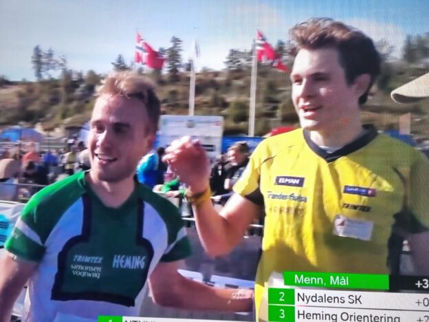 Skjermdump. Kasper Harlem Fosser og Tobias Alstad etter målgang.